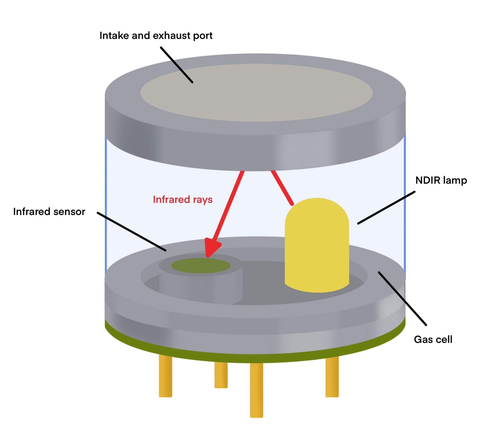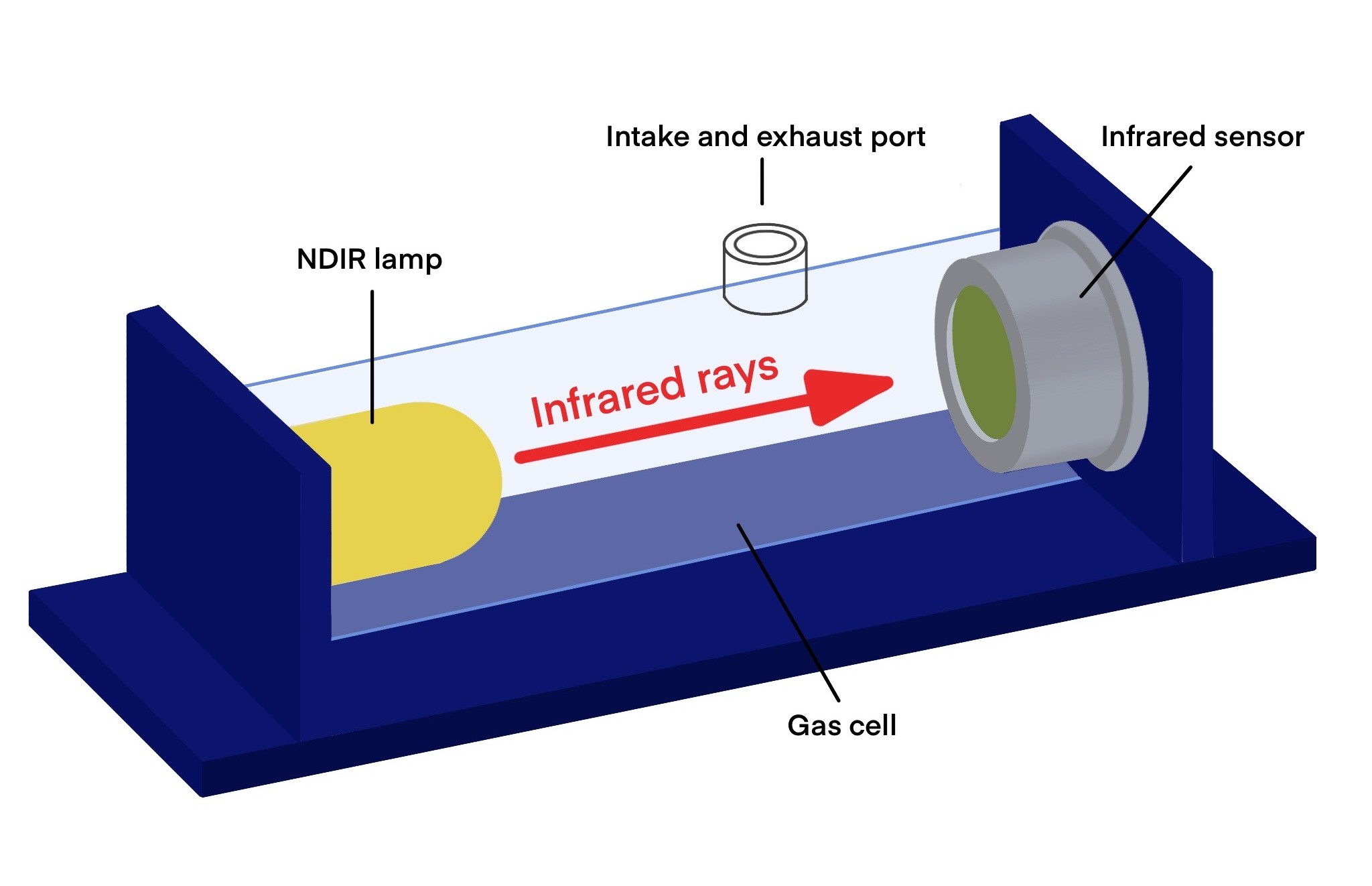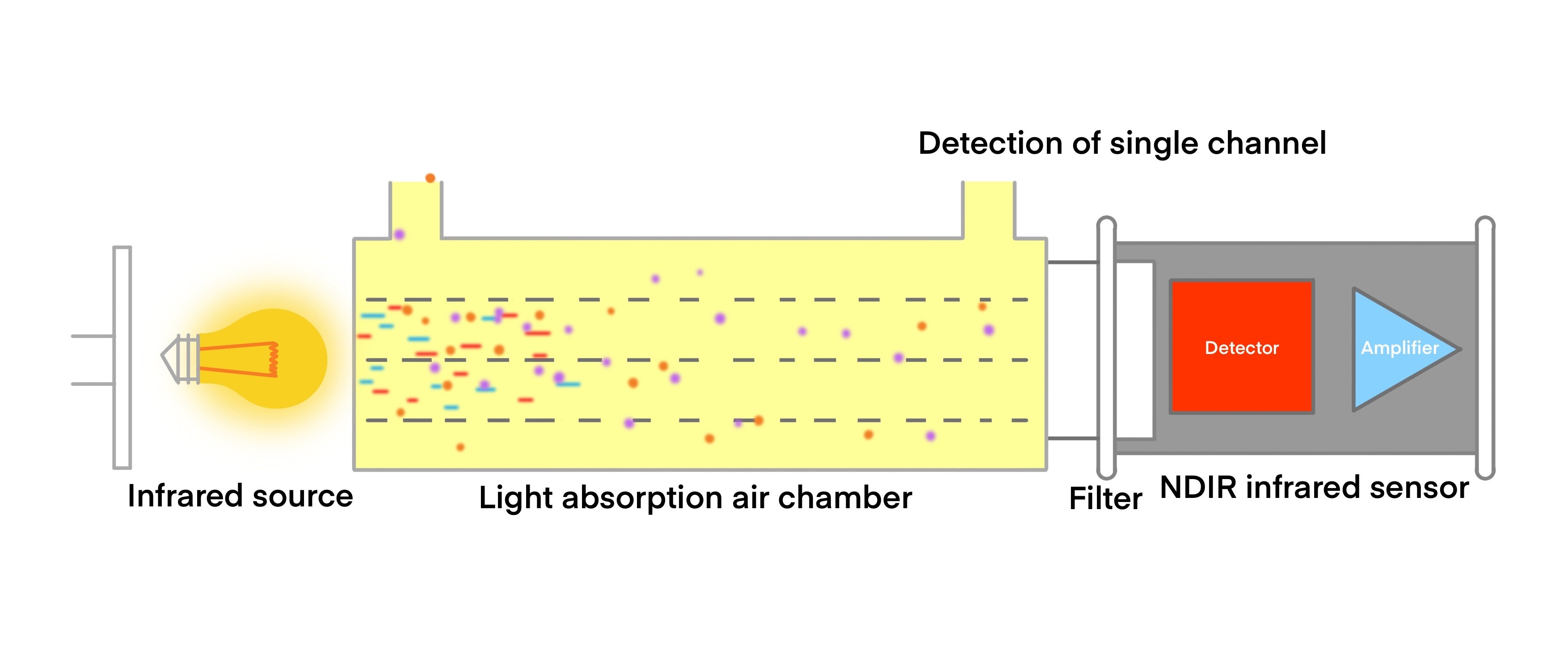 The main components of an NDIR sensor are an infrared (IR) source, a sample chamber, a light filter, and an infrared detector. One of the important factors for measuring gas concentration using the NDIR method is an infrared source with higher infrared output.