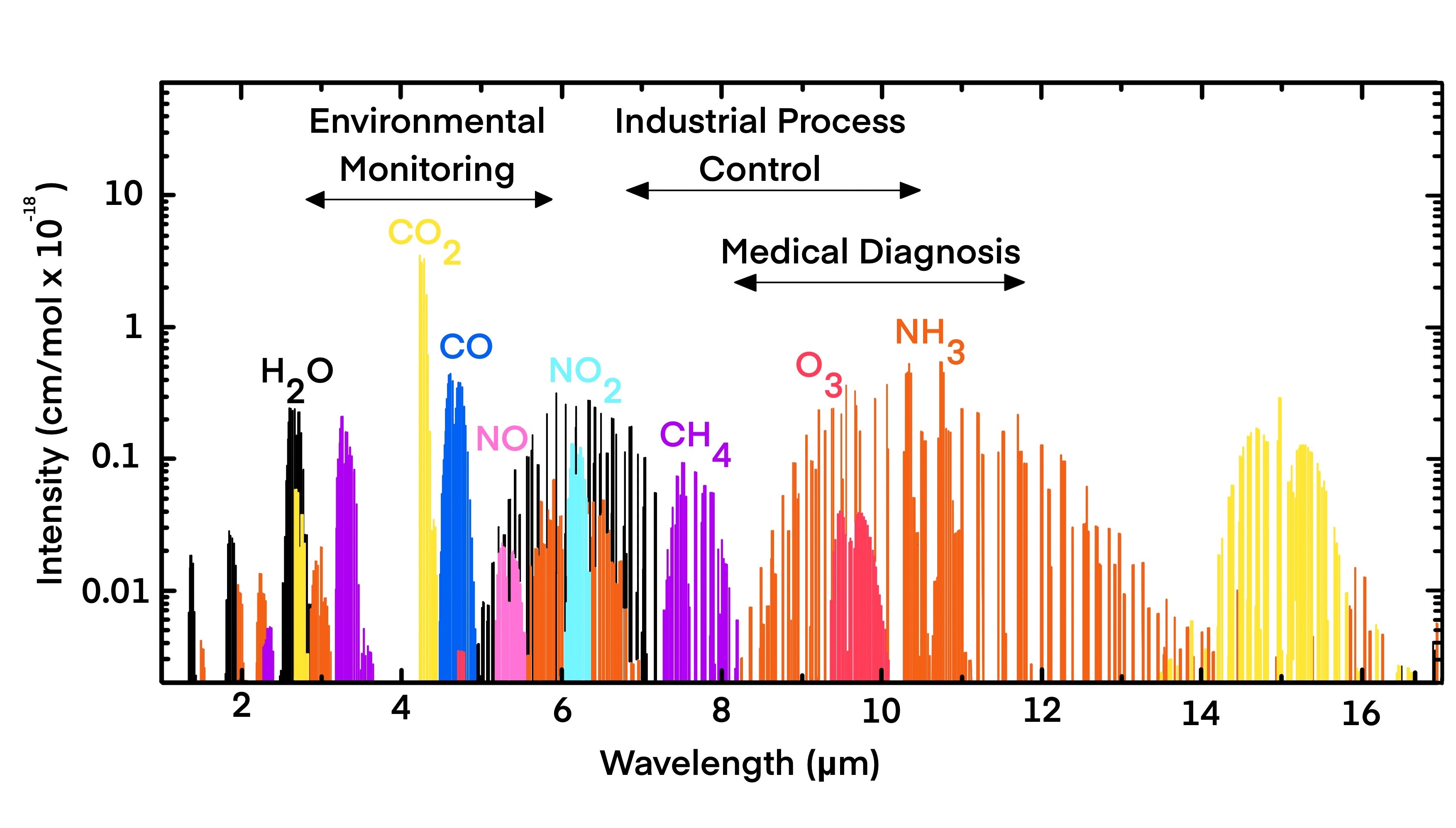 Non-dispersive infrared is the gas concentration measurement method that uses each gas's unique absorption wavelength range. IR light is absorbed by the target gas and this absorption is quantitatively described by the Beer-Lambert law: